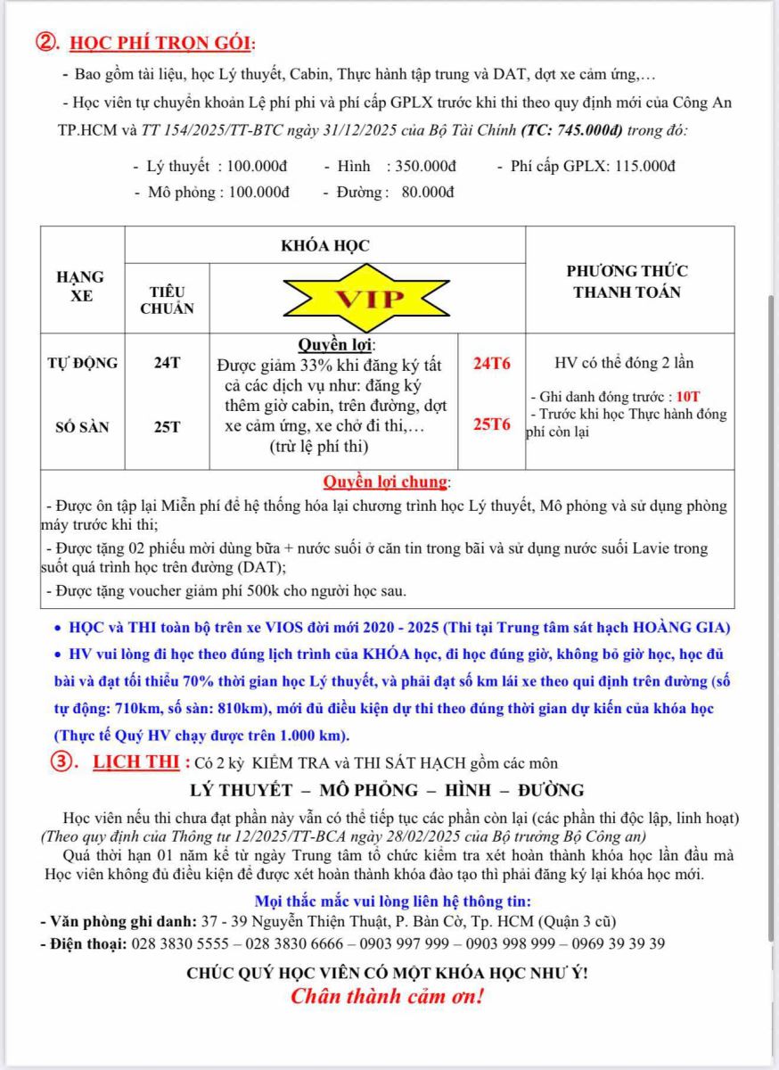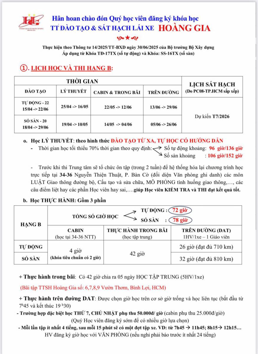 Khóa đào tạo KHÓA ĐÀO TẠO HẠNG B Share on Đào tạo Khoá đào tạo Trả giấy phép lái xe Tin mới HƯỚNG DẪN NHẬN BIẾT VÀ GHI NHỚ NHÓM BIỂN BÁO CẤM - TRUNG TÂM HOÀNG GIA Bạn cần làm gì để không 'rớt' kiểm định khí thải ô tô áp dụng từ 1.3.2026? Ngày khai trương Mùng 8 Tết, học viên đến ghi danh tại Trung Tâm Hoàng Gia sẽ nhận ngay 2 triệu